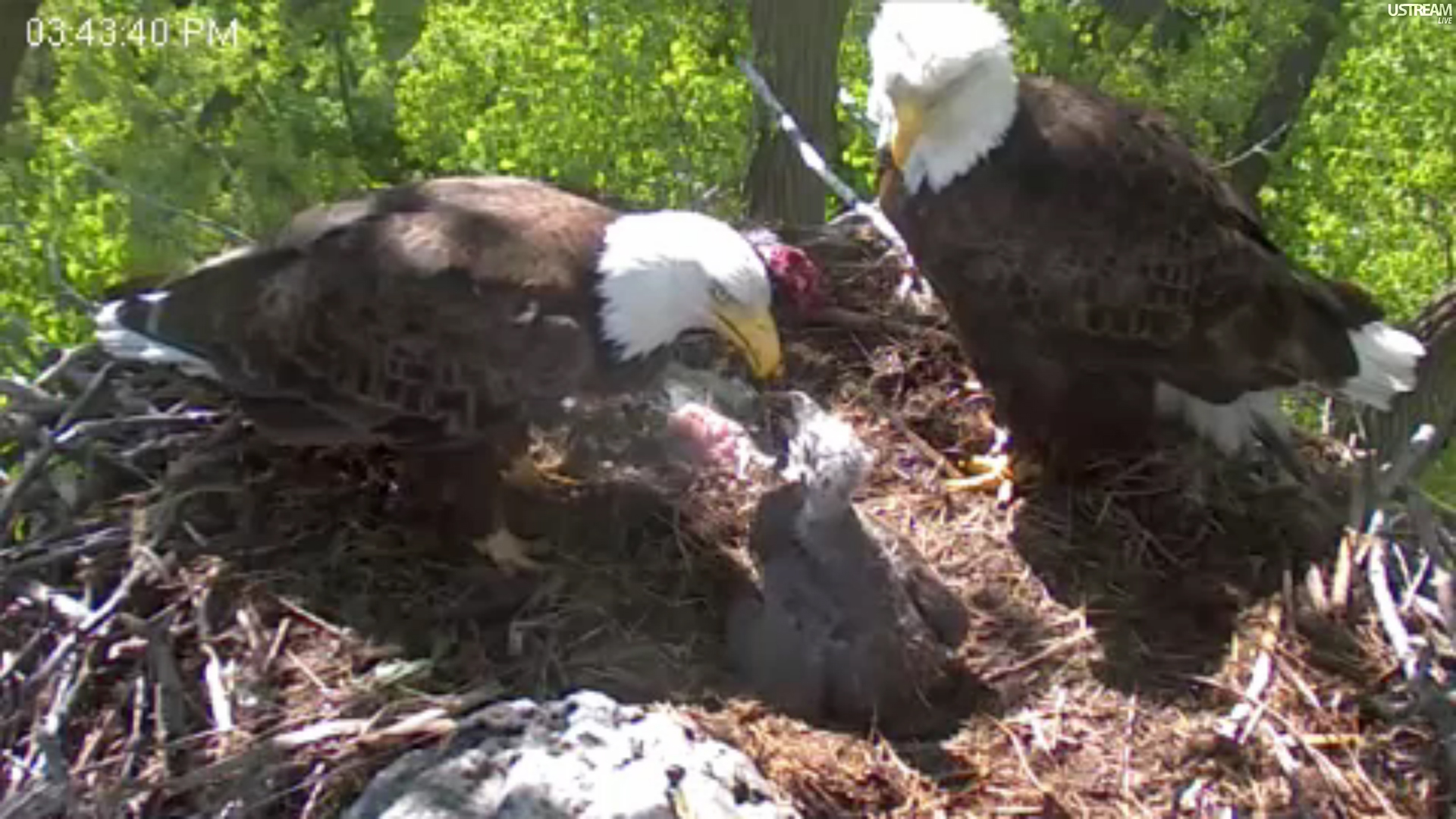 By the time I tuned in, mom was sitting vigil where, stuck deep in the nesting material and struggling weakly to free himself, was a fuzzball named Harmon, his little head resting on an old, rotting, fish corpse. He’d been stuck there for about 24 hours and was obviously exhausted, unable to eat or move. The University of Minnesota Raptor Center had just gotten a permit to attempt a rescue, and within minutes of my viewing, mom flew off, spooked by noises from below.