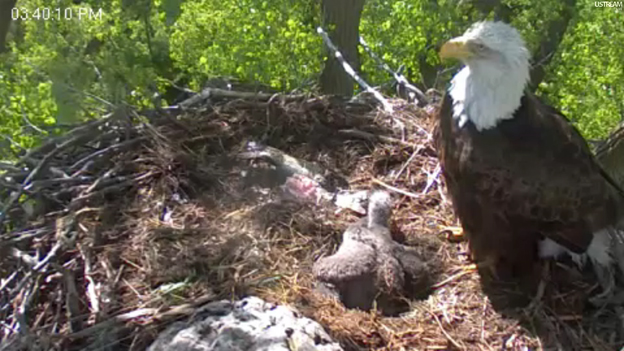 First, I discovered a video camera trained on an established nest in Shepherdstown, West Virginia. There, B1 and B2 were cozily tucked into the nest, sleeping. When dad swept in with a large trout ensnared in his talons, life got interesting. I watched as Dad and Mom took turns bringing lunch, dinner, and breakfast to feed their hungry children. But along the way, I discovered another eagle cam, this one in Minnesota and filled with tremendous drama.