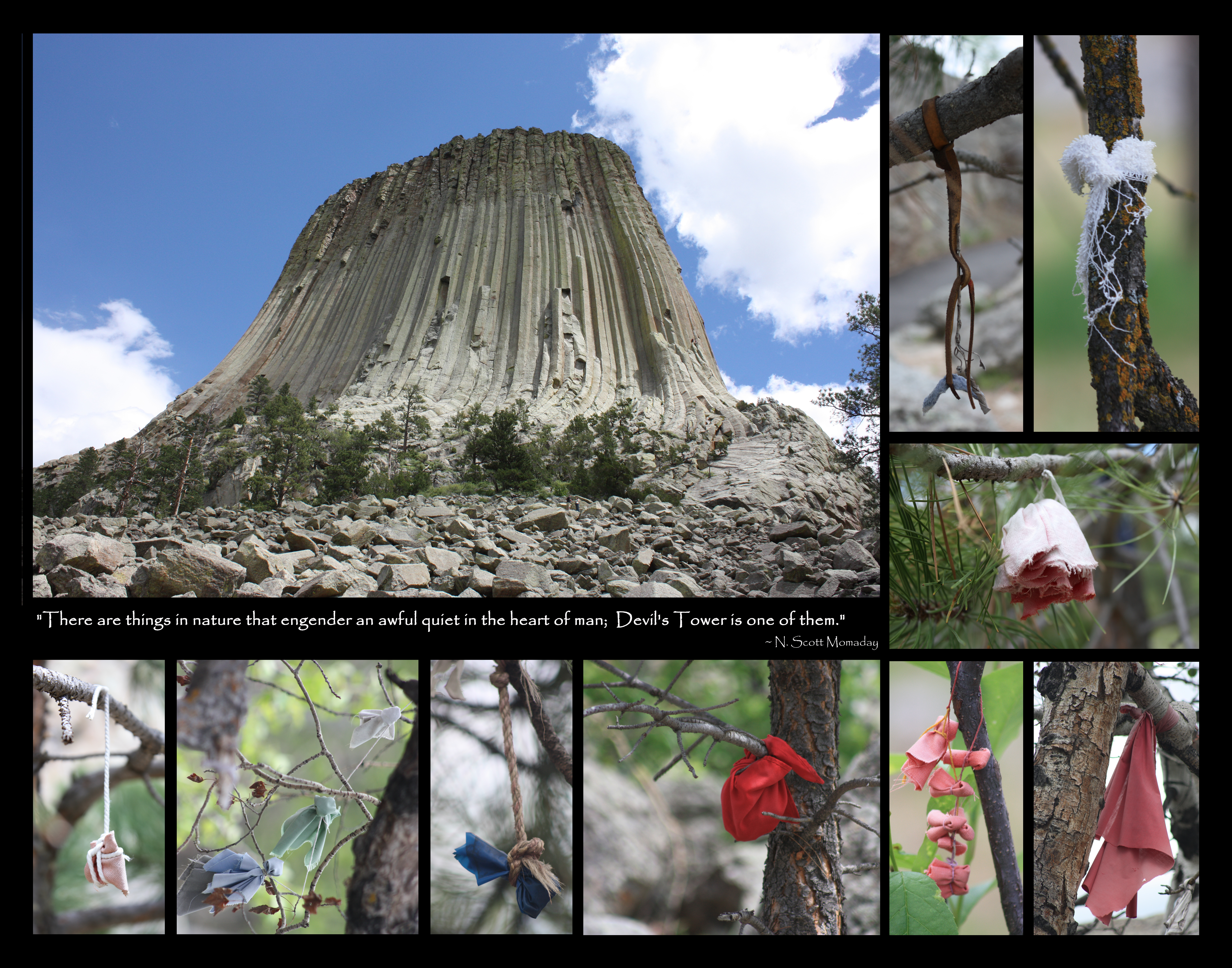 We visited Devil’s Tower a few years ago and were struck not so much by the huge towering hunk of rock as by the dangling offerings of tobacco and torn fabric adorning the branches of the surrounding trees. Devil’s Tower is sacred to Native Americans and their offerings are a testament to it. This compilation of my photos cannot do justice to the sense of awe I felt while in the presence of such community.