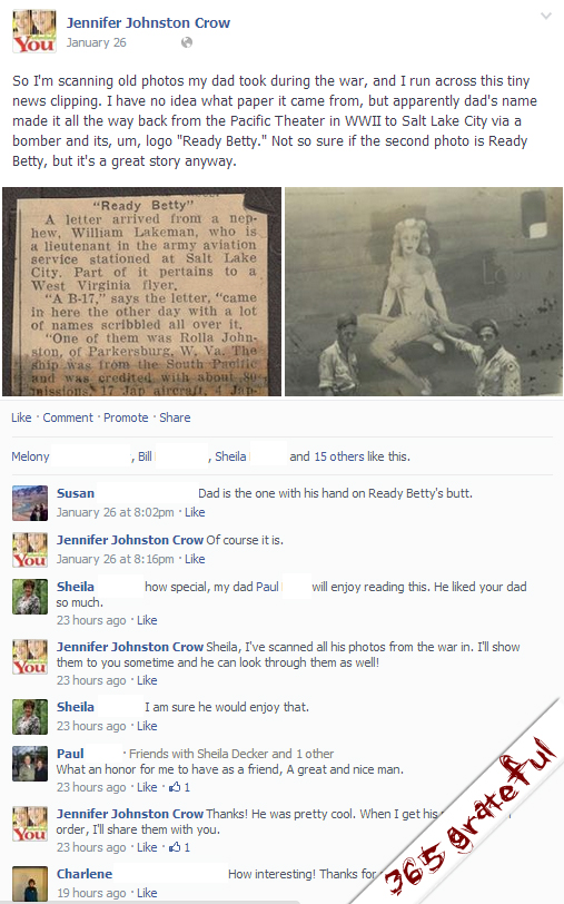Sometimes things just sneak up on you. Preparing to move, we’re sorting through nearly 25 photo albums, culling, sorting, and scanning. In a pouch, I find my dad’s photos from World War II that he sent home to Mom. Then, in an old, old book, I find a clipping that I’ve never seen before. What triggered my gratitude wasn’t the photos and clippings, though, it was the sentiment expressed by others about my dad. I knew he was a pretty good guy. It’s nice to know others thought so, too. Grateful I had him in my life for so long.