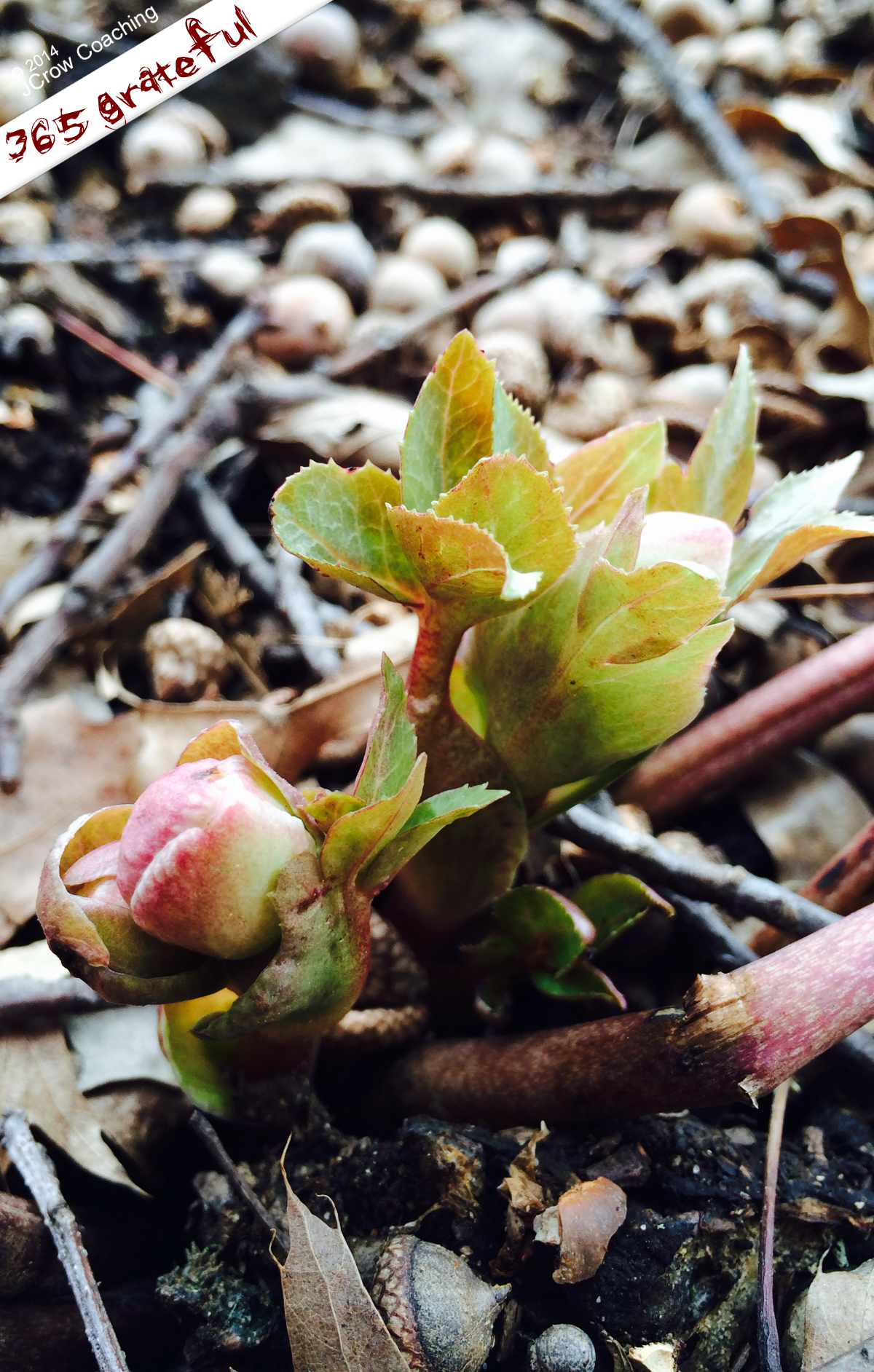 Grateful for signs of spring! My Hellebore is pushing aside the detritus of winter. Spring, as far as I’m concerned, has sprung.