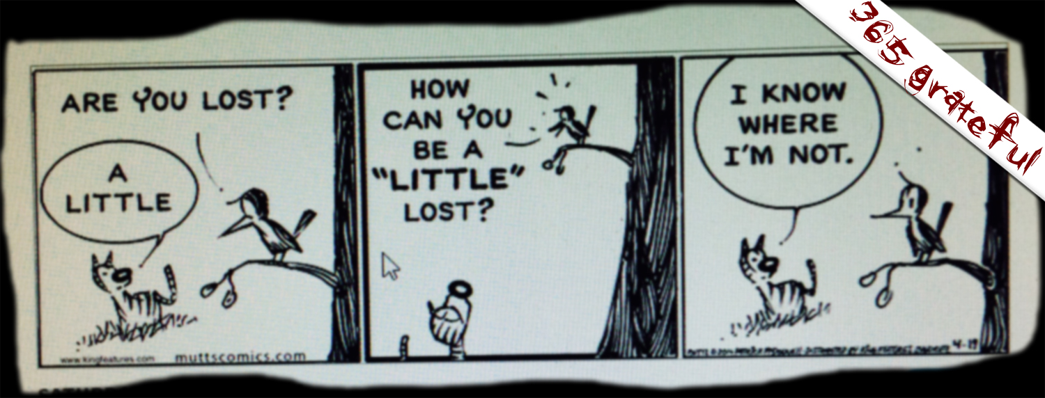 Grateful for artists who create thought-provoking images that reveal huge, awesome perspective switches in ways that make us smile, like Mutts creator Patrick McDonnell. My take: If we know where we’re not, then we have some inkling of where we want to be or have some sense of not being in the right place. Either one is a great place for diving into the deep end of the pool.