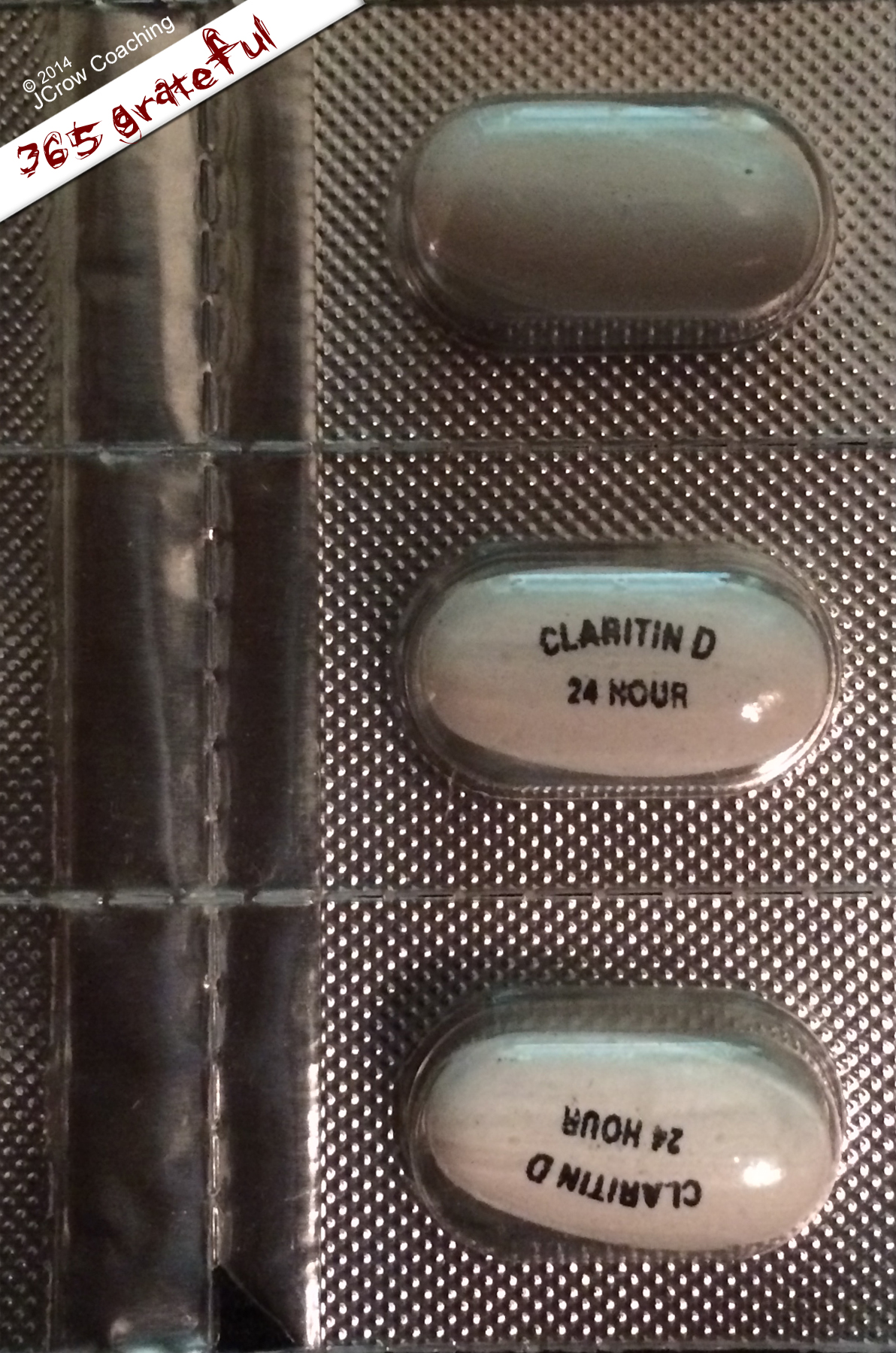 365 Grateful: 05.13.2014 Posted on May 14, 2014 by Jennifer Johnston Crow Posted in GratitudeTagged 365 Grateful, breathe, Claritin D, decongestant, gratitude Sometimes gratitude comes in tiny, foil-wrapped packages, like this Claritin-D® 24-hour pill. Grateful that I can breathe without too much effort today. Share this: Click to share on Facebook (Opens in new window) Facebook Click to share on Pinterest (Opens in new window) Pinterest Click to share on X (Opens in new window) X Click to share on LinkedIn (Opens in new window) LinkedIn Click to share on WhatsApp (Opens in new window) WhatsApp More Click to print (Opens in new window) Print Click to email a link to a friend (Opens in new window) Email Click to share on Tumblr (Opens in new window) Tumblr Click to share on Reddit (Opens in new window) Reddit Click to share on Pocket (Opens in new window) Pocket Like Loading... Related