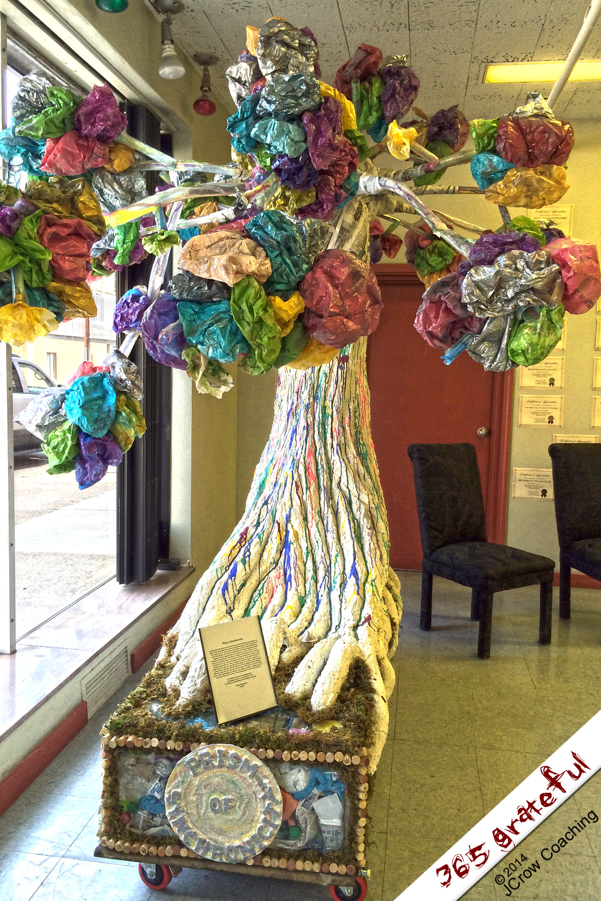 Two student artists from a local college created this amazing tree — from trash. Prism of Synchronicity currently graces the front room of the Artsbridge office, a non-profit arts funding organization working tirelessly to bring art education and experiences to school children and to provide grants for arts organizations, artists, and groups.