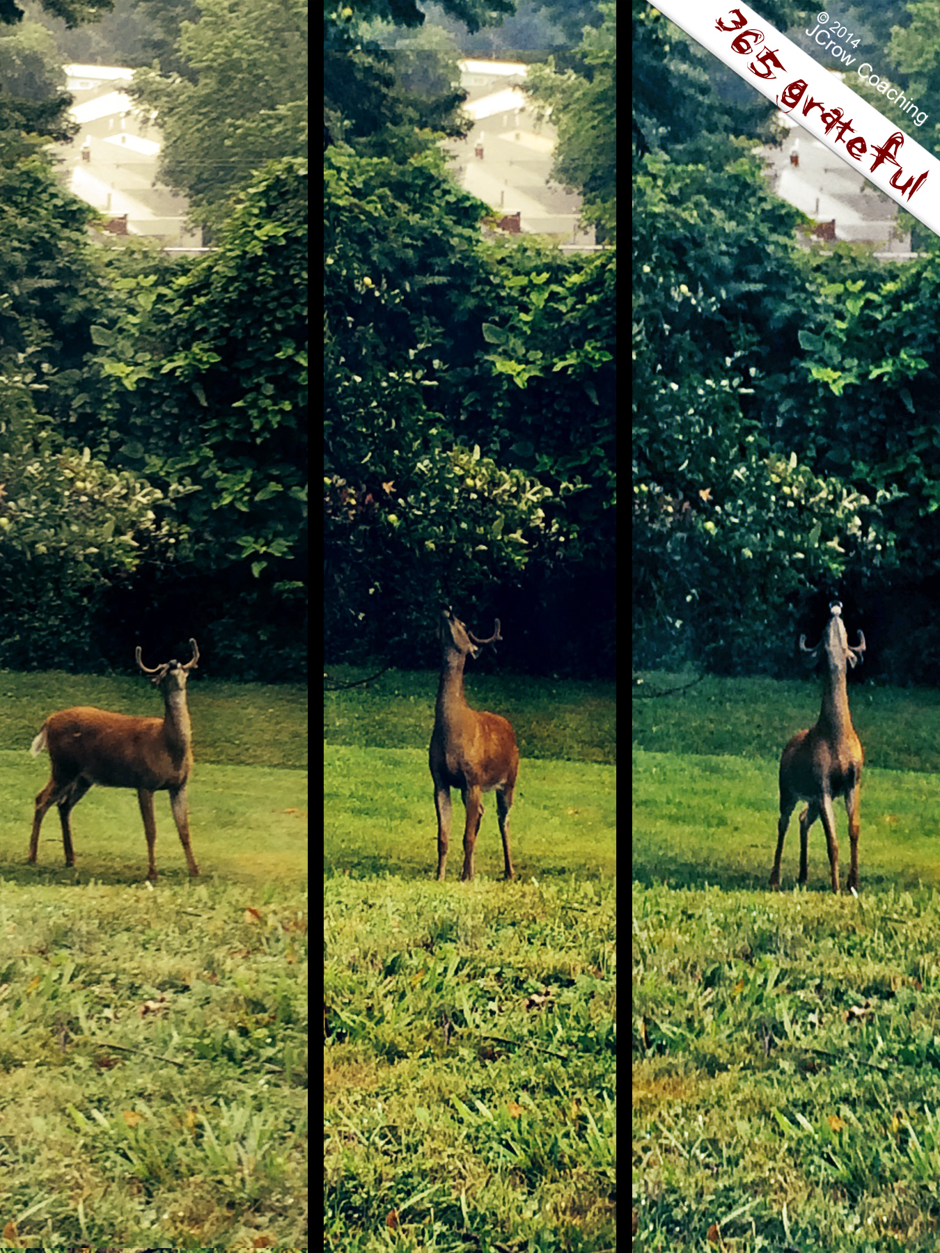 I’ve watched his antlers steadily appear, all nubby at first then more branched. Today, as he ripped apples from our tree, he looks to be a six-point buck. I’m grateful for the opportunity to watch the process and marvel at the natural order of life. It helps me understand that the news of wars and famine, weather and madmen, intrigue and angst that dominates our human world is, in the end, of no concern to the inexorable movement of the nature in her own time. I choose to march in step with that, and it comforts me.