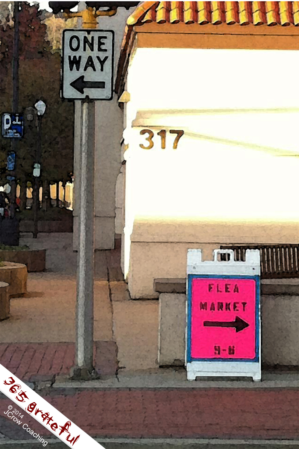 There are signs everywhere. The trick is deciding which path is ours. How do we know which to ignore and which to follow, when to buck the crowd and when to toe the line? I’m actually grateful for signs, because they help us get our bearings and make choices when we’re lost. Once we’re under way again, most signs lose their power because they can’t tell us anything other than a direction. Does this path resonate with us? Is there heart in the journey? That’s when we look beyond the signs to the path itself. Be grateful for signs, but be willing to leave that gratitude behind when the path no longer serves. Go ahead; tun right toward the flea market. There’s more than one way.