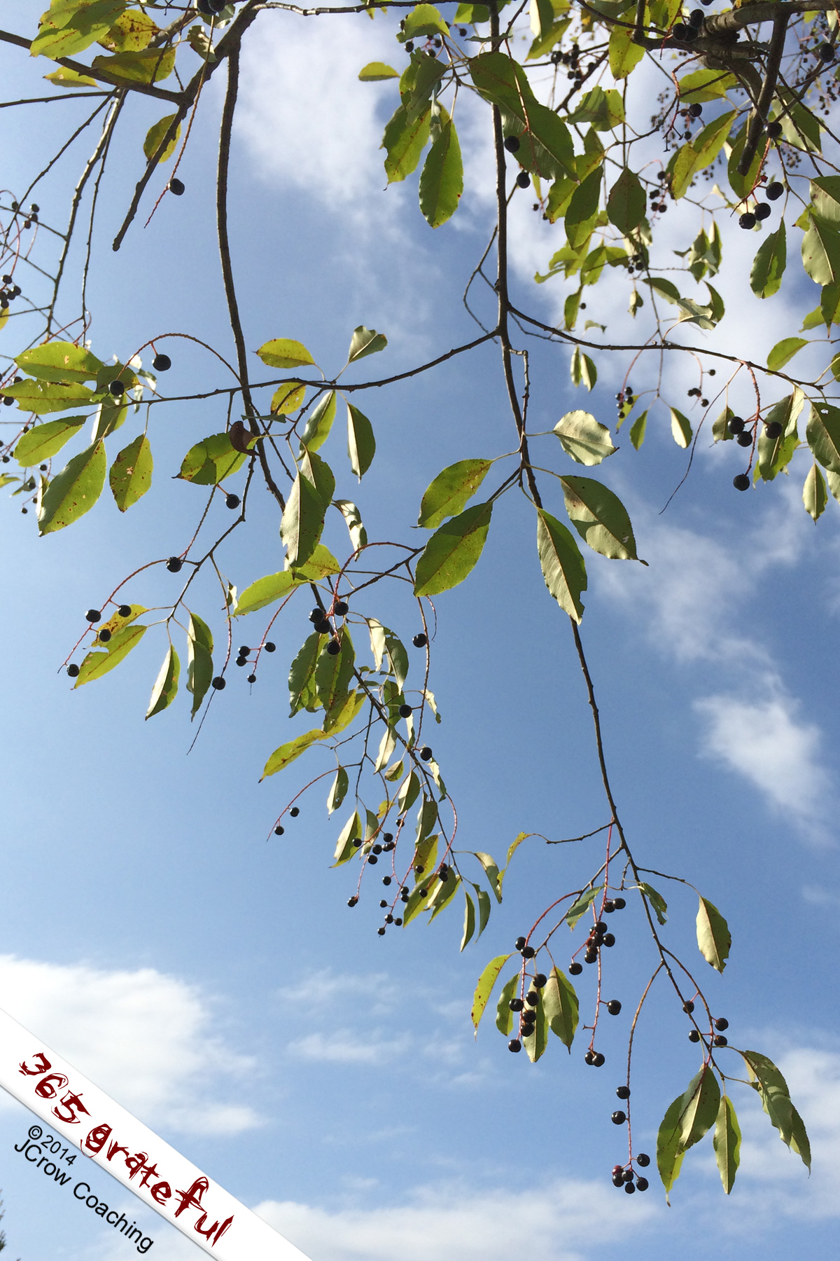 While wandering, I look up to enjoy the warmth of the August sun and the beauty of a cloud-studded blue sky. The tree under which I find myself is loaded with black fruit — it’s a black cherry, or a wild cherry, I think. I hear the chirps of at least three species of bird, the rustle of what must be a squirrel. It’s good, I think, that this smorgasbord is free for these creatures. There’s something perfectly right about nature nurturing nature. I’m grateful for the sight of blue sky through limbs loaded with sustenance for the ones who are sitting patiently, or not so patiently, for me to continue my journey so they may feast. It’s a good day.