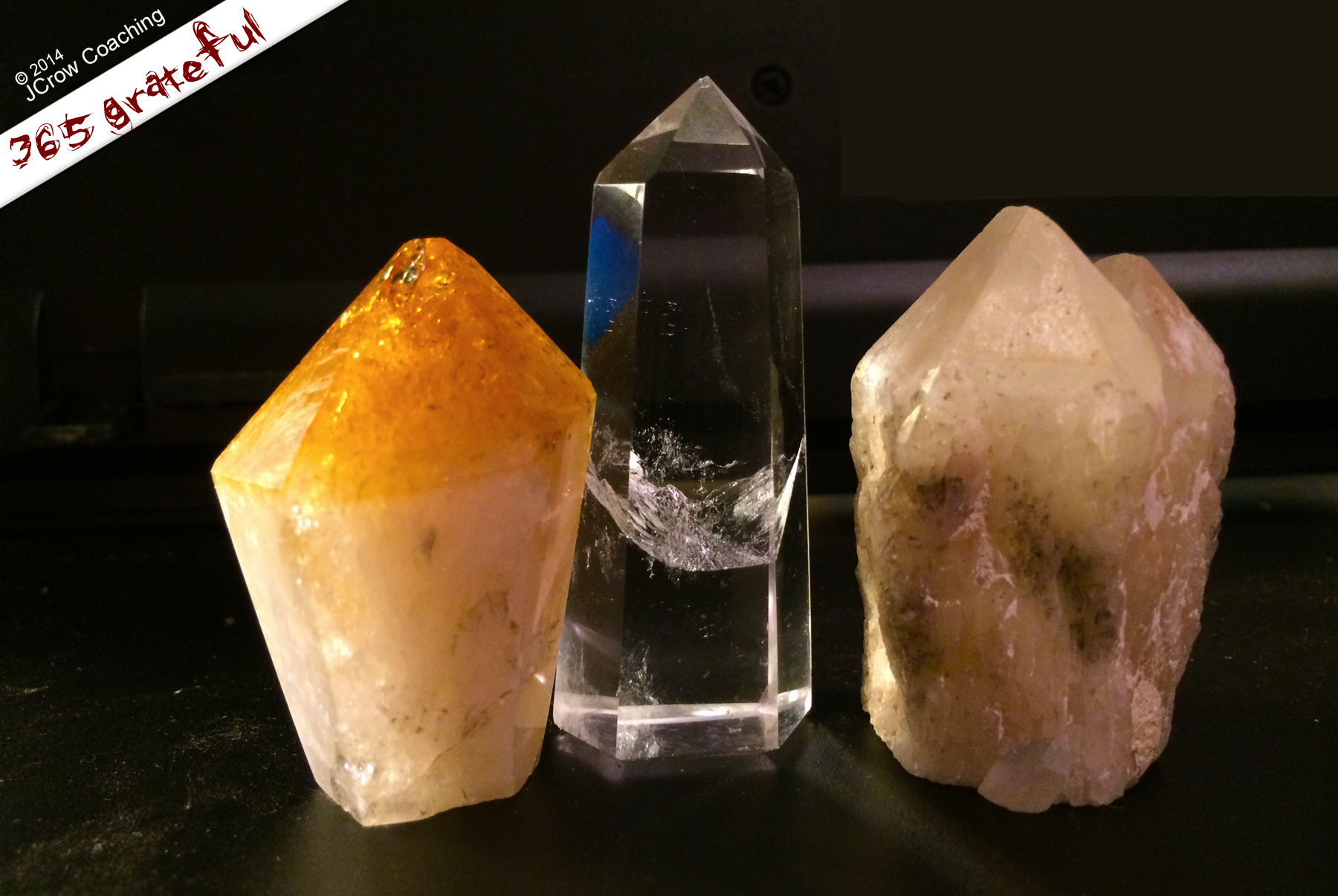 From the left is a citrine crystal point (hexagonal), a clear quartz crystal with occlusions (hexagonal), and a candle quartz crystal (hexagonal), so named because it’s reminiscent of the melted wax along the sides of a candle.