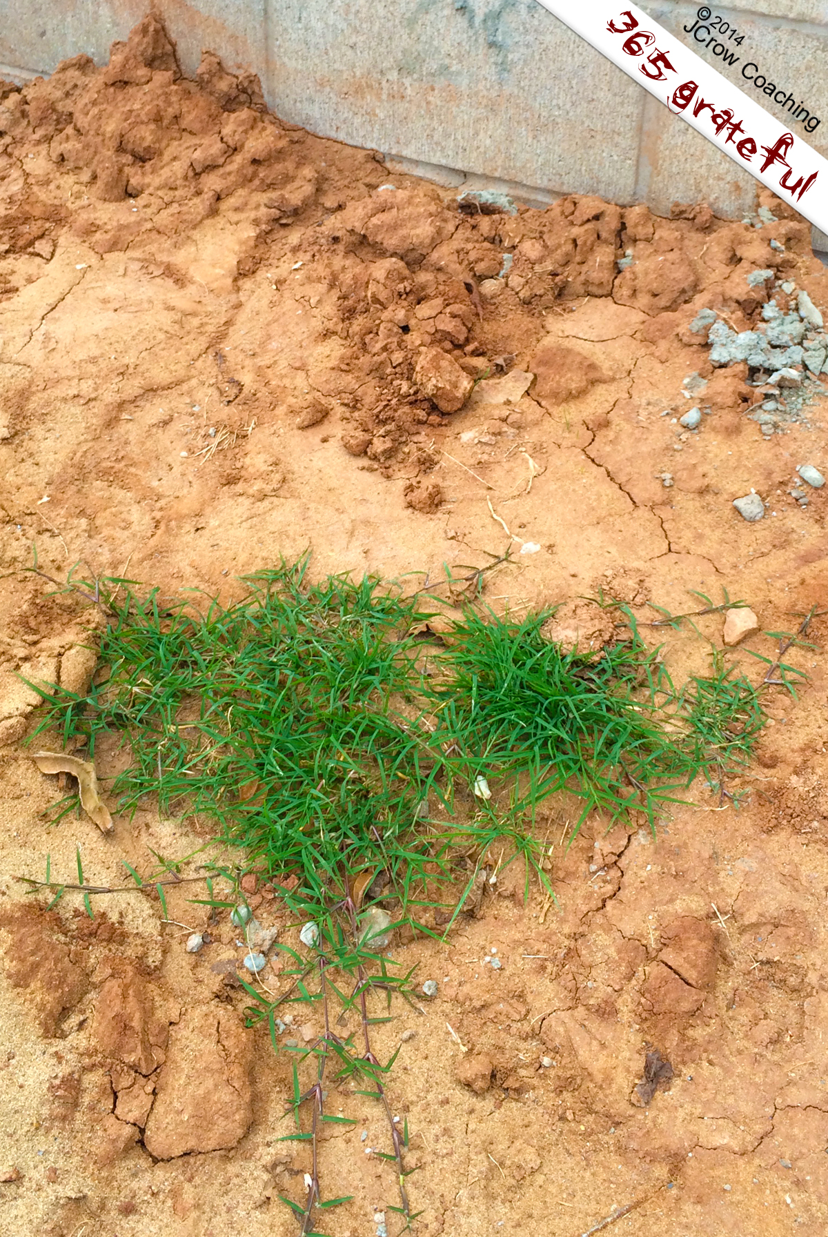 So, we visit the new home site tonight, and the one thing I notice is this little stubborn patch of grass in a sea of red clay — baked red clay, by the way, because there’s been no real rain for a while.