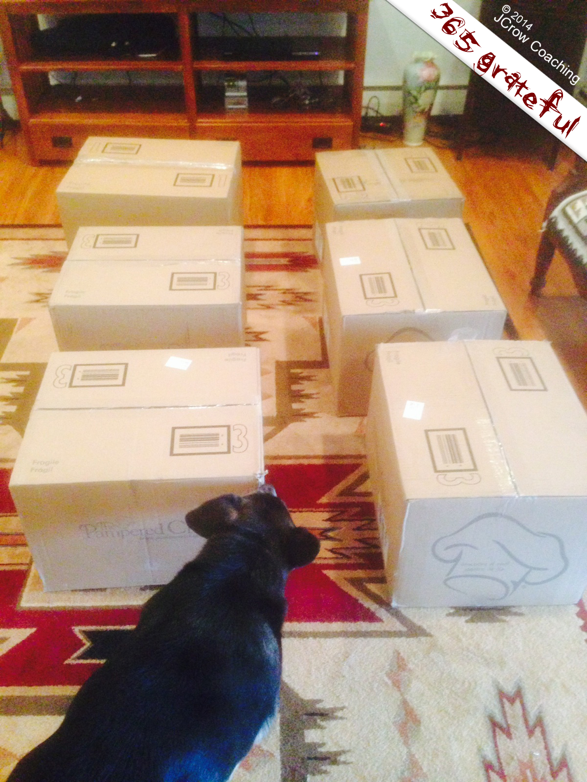 Trick or Treat! Data seems to have discovered the box with the Pizza Crust packed inside, since everything else is non-edible and inert. Grateful, today, for the definite treat of receiving a huge Pampered Chef order within three short days of placing it. Now, THAT is service, and it’s something I greatly appreciate. As I’ve – ahem – matured, I’ve come to realize this: shoddy customer service sends me off to other stores and other providers quicker than anything else. Here’s to customer service, and here’s to the companies that still believe in it.
