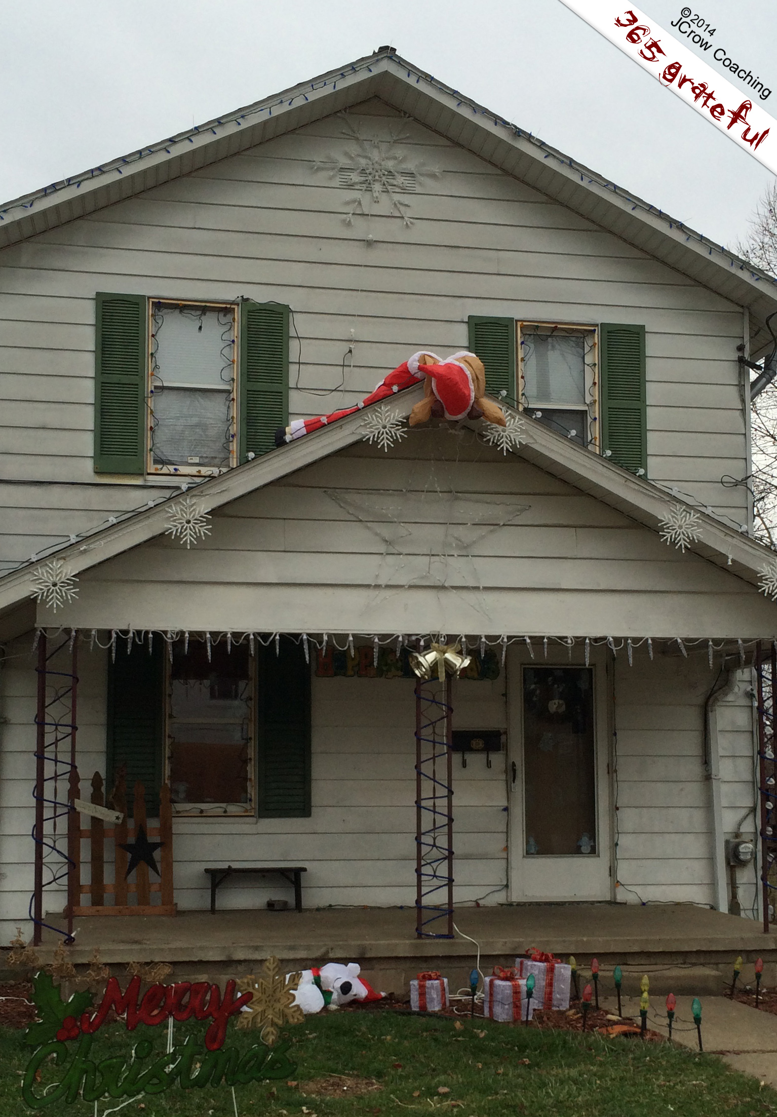Although what I see in the daytime is that Rudolph appears to have met with an untimely accident on the roof of this house, what I see at night is a colorful celebration of the joy of this season. Today (and tonight), I am grateful for the pleasure it gives people to decorate and celebrate such a festive time of year, even if Rudolph has to sleep it off during the day.