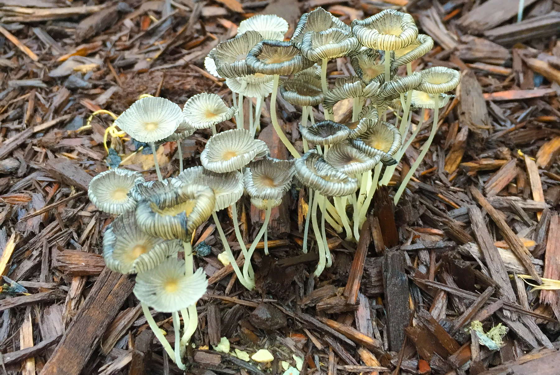 They’re tiny little things, these fungi in my front mulch, clinging somehow to elusive nutrients in sticks and chips of wood, made hospitable by the fact we’ve had rain nearly every day for a month or two.