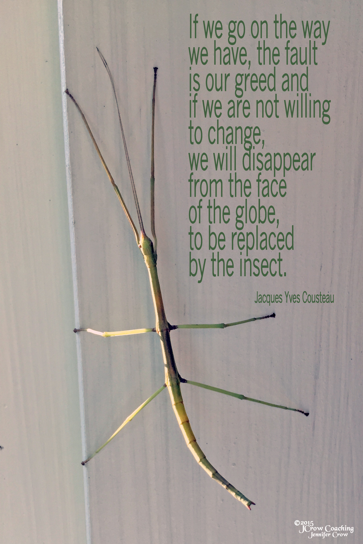 I think it odd to see a four-legged species — an anomaly for sure, given that his kind sports six twiggy appendages, but as I gaze at him, he takes a few lumbering steps. Ah, there they are! Two legs splayed directly above his head like thick, stick-like antennae, obscuring the more delicate feelers below.