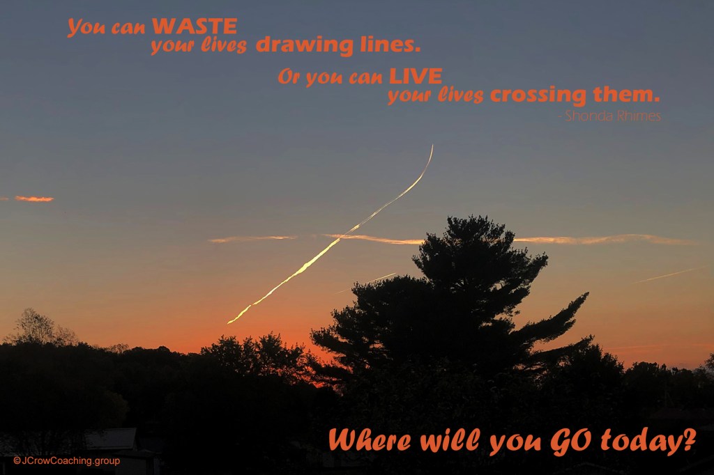 Yet I’m thinking there is more to the question, quite likely a bit occluded (maybe by those contrails). We can be so entranced by the lines we draw that we never cross them and venture into side journeys and experiences along the way.