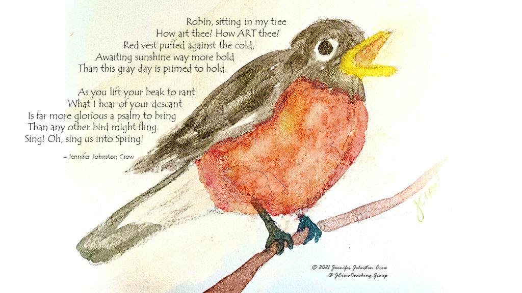365 GRATEFUL: Robins in Spring Posted on April 16, 2021 by Jennifer Johnston Crow Posted in GratitudeTagged 365 Grateful, gratitude, robin, sing, spring Share this: Click to share on Facebook (Opens in new window) Facebook Click to share on Pinterest (Opens in new window) Pinterest Click to share on X (Opens in new window) X Click to share on LinkedIn (Opens in new window) LinkedIn Click to share on WhatsApp (Opens in new window) WhatsApp More Click to print (Opens in new window) Print Click to email a link to a friend (Opens in new window) Email Click to share on Tumblr (Opens in new window) Tumblr Click to share on Reddit (Opens in new window) Reddit Click to share on Pocket (Opens in new window) Pocket Like Loading... Related