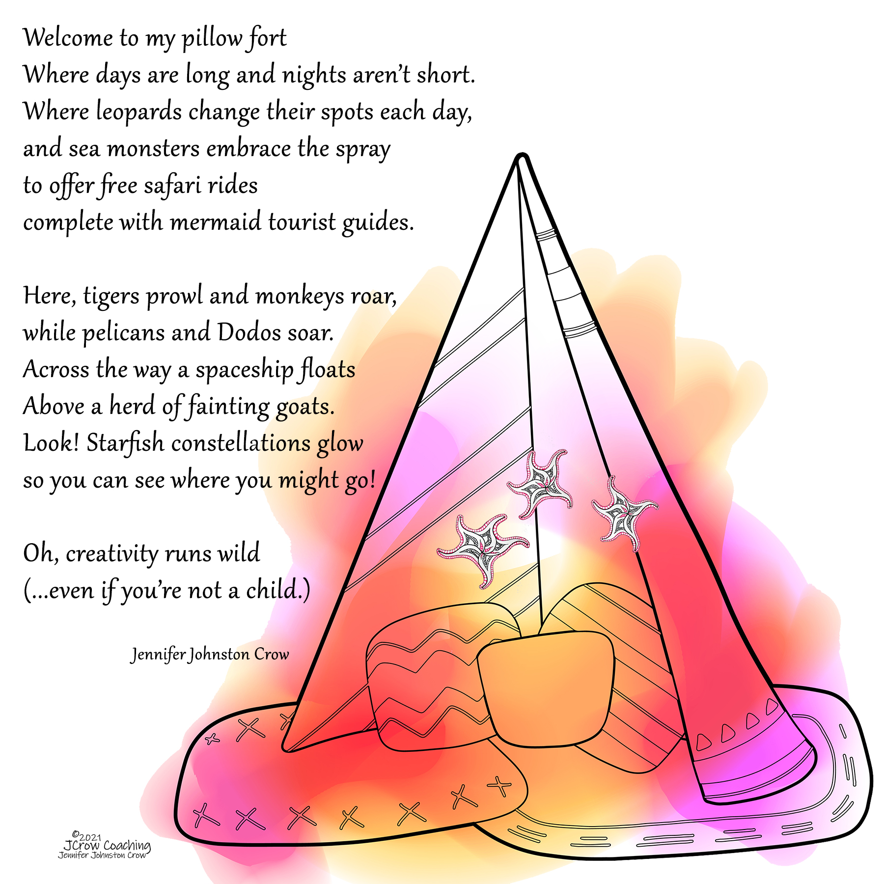 I woke up with these words the other day, and I attribute it to creativity guru Jill Badonsky’s email signature that always includes “sent from my pillow fort.” I’ve always loved that, especially the child-like creativity and sense of play it inspires in me.