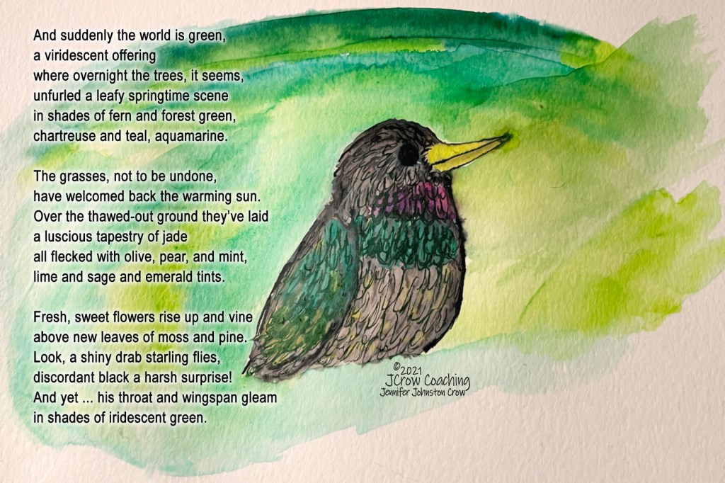This morning I woke up just before the sun, stumbled to the bathroom, fed the cat, and sat down on the sofa looking out into nature. And there it was: green. Overwhelming greenness everywhere. Leafy greens of multitudinous shades. Grasses and weeds alike sporting new, glowing growth. How did this happen overnight? It was as though the world splashed buckets of paint all over itself. And then, a starling flitted by my window to perch in full view on the deck railing. Not a fan of those European stowaways. But a closer look showed his true colors, and they took my breath away.
