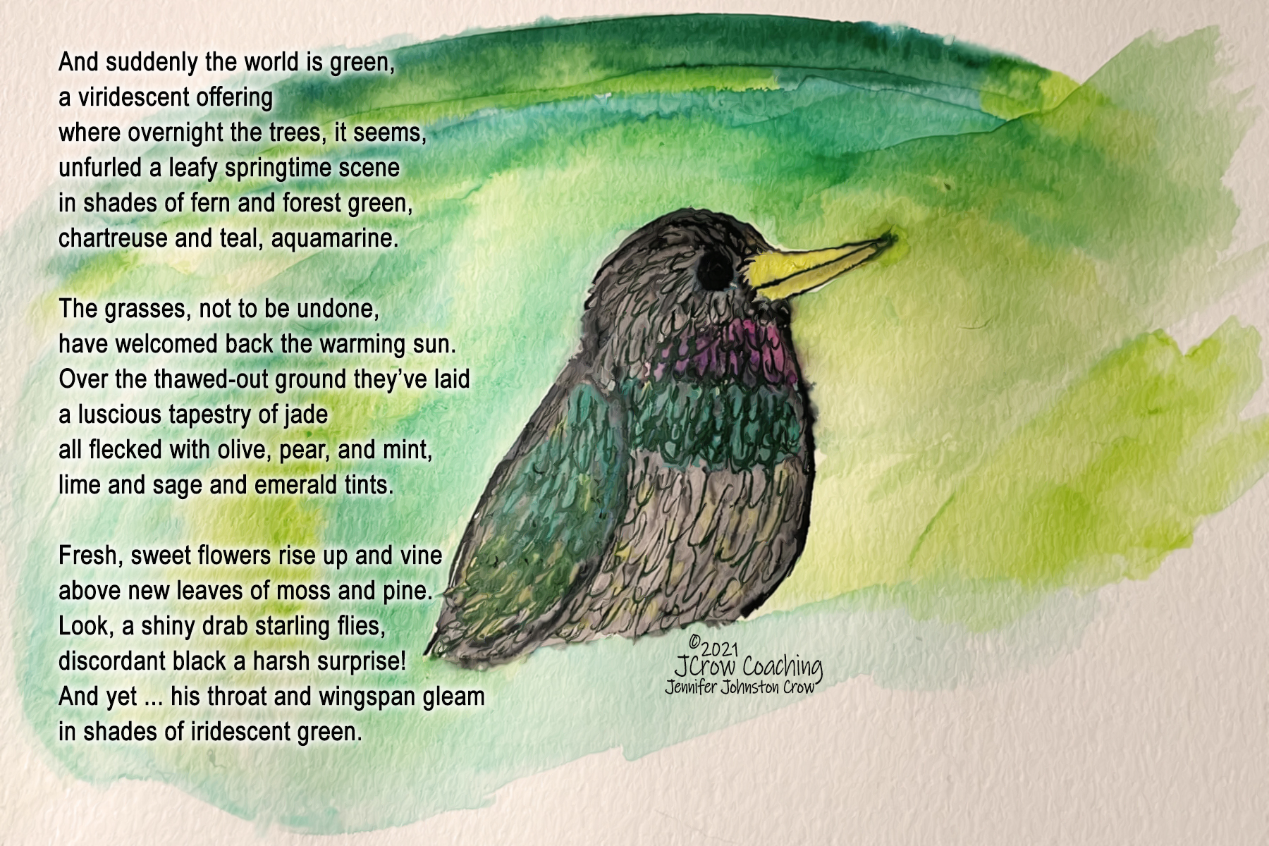 This morning I woke up just before the sun, stumbled to the bathroom, fed the cat, and sat down on the sofa looking out into nature. And there it was: green. Overwhelming greenness everywhere. Leafy greens of multitudinous shades. Grasses and weeds alike sporting new, glowing growth. How did this happen overnight? It was as though the world splashed buckets of paint all over itself. And then, a starling flitted by my window to perch in full view on the deck railing. Not a fan of those European stowaways. But a closer look showed his true colors, and they took my breath away.