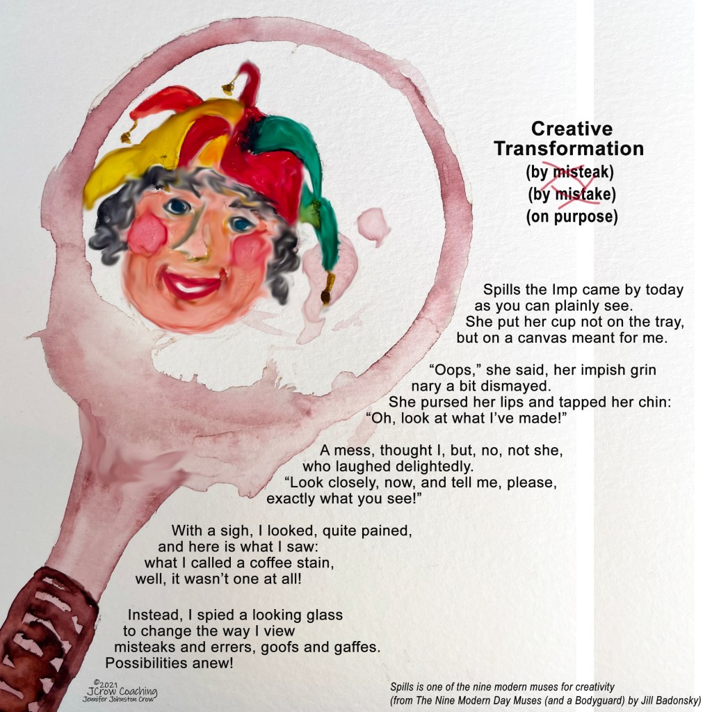 Been studying on Spills, the Imp, one of the nine modern muses for creativity. She (or he, if you prefer) is all about imperfection vs. paralyzing perfection and finding the aha moments in errors and mistakes, and using them to slingshot to new, creative ways of thinking.