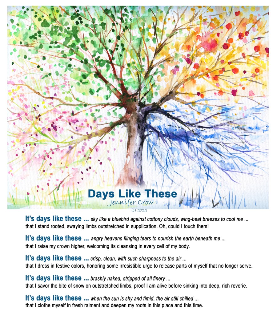 Ah, we can learn so much from nature. As I was driving up the driveway to home, this most amazing blue sky with puffy white clouds salting it, and the trees in the woods stretching upward, captured my breath. Chewing on a creative prompt to write about a tree without saying it’s a tree, and there, nature handed it right to me.